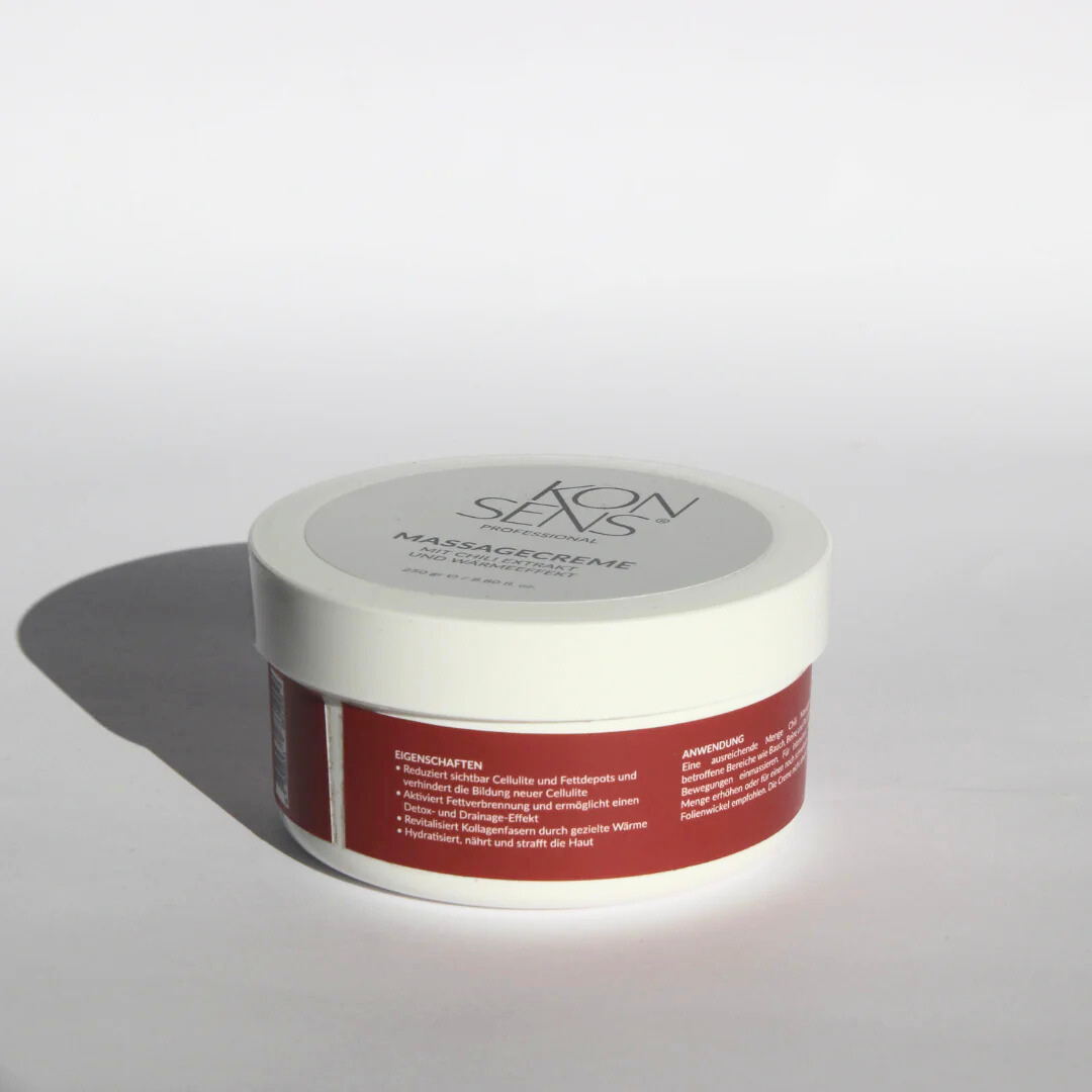 Die Textur ist perfekt für eine längere Massage, sie lässt sich gleichmäßig verteilen und hat einen angenehm wärmenden Effekt, der die Durchblutung sichtbar fördert. Meine Kundinnen berichten von einem sofort spürbaren Hautstraffungsgefühl und genießen das wohltuende Wärmegefühl.