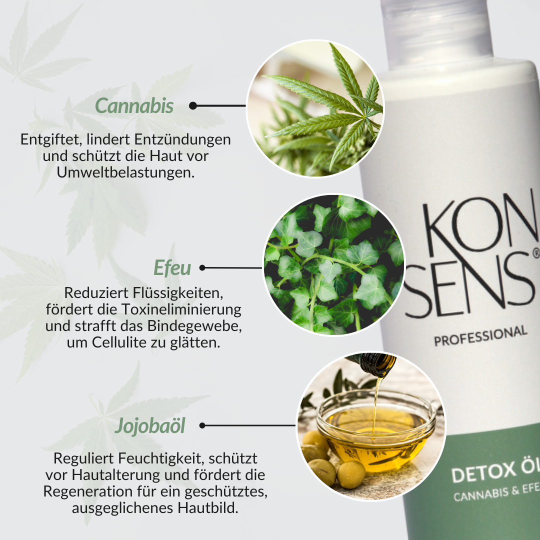 Seit Jahrtausenden ist die positive Wirkung der Cannabis Pflanze auf Körper und Haut bekannt. Unser Detox Öl mit Cannabis und Efeu vereint hochkonzentrierte natürliche Antioxidantien, ungesättigte Fettsäuren und Vitamine, die sich positiv und entgiftend auf die Gesundheit auswirken. Während der Massage entfaltet dieses Öl seine energische Wirkung auf Haut und Haar, beeinflusst dabei positiv den Organismus und fördert die Durchblutung.