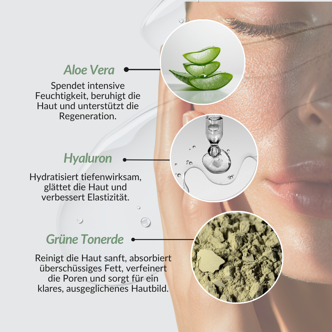 Tauche ein in pure Verwöhnung für deine Haut! Unsere luxuriöse Aloe Vera & Hyaluron Gesichtsmaske zieht porentief ein, spendet intensive Feuchtigkeit und beruhigt selbst gestresste Haut. Spüre, wie deine Haut praller, ausgeglichener und strahlend frisch wird – ganz ohne Abwaschen.