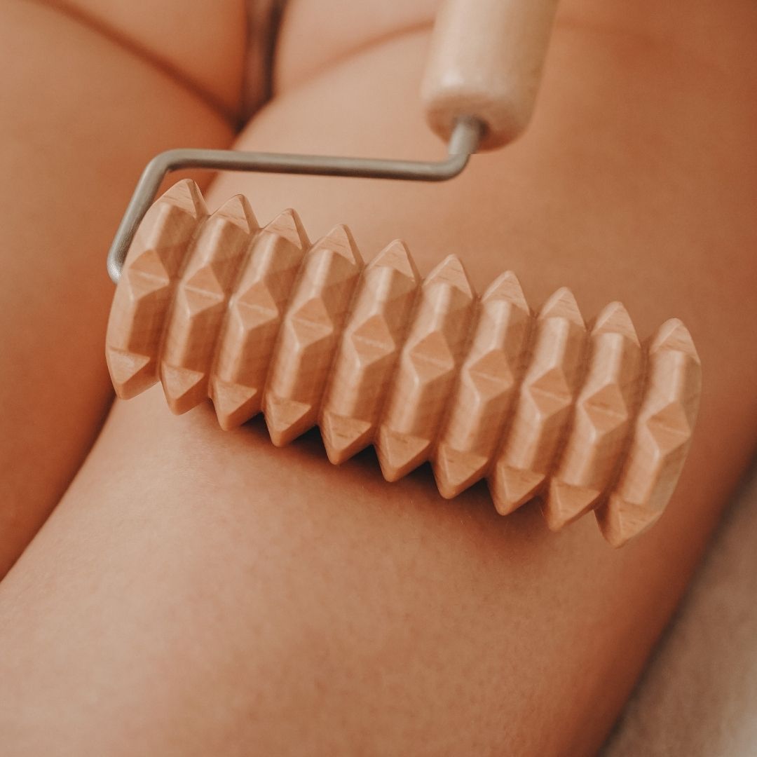 Anwendung: Das Holzelement wird in zwei Richtungen 'rauf und runter' gerollt. Wichtig bei dieser Holzwalze ist, dass sie erst zum Einsatz kommt, nachdem eine Auflockerung des Gewebes stattgefunden hat.